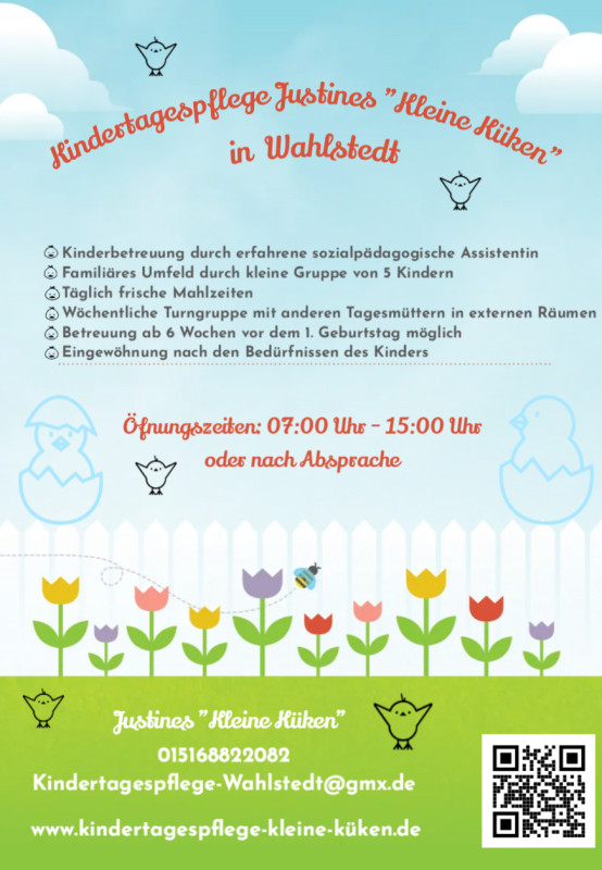 In einem Einfamilienhaus mit Garten, in ruhiger Lage, bietet sich viel Platz zum erforschen und entdecken. Ich biete eine liebevolle und professionelle Betreuung mit Erfahrung als ausgebildeten Sozialpädagogischen Assistentin.